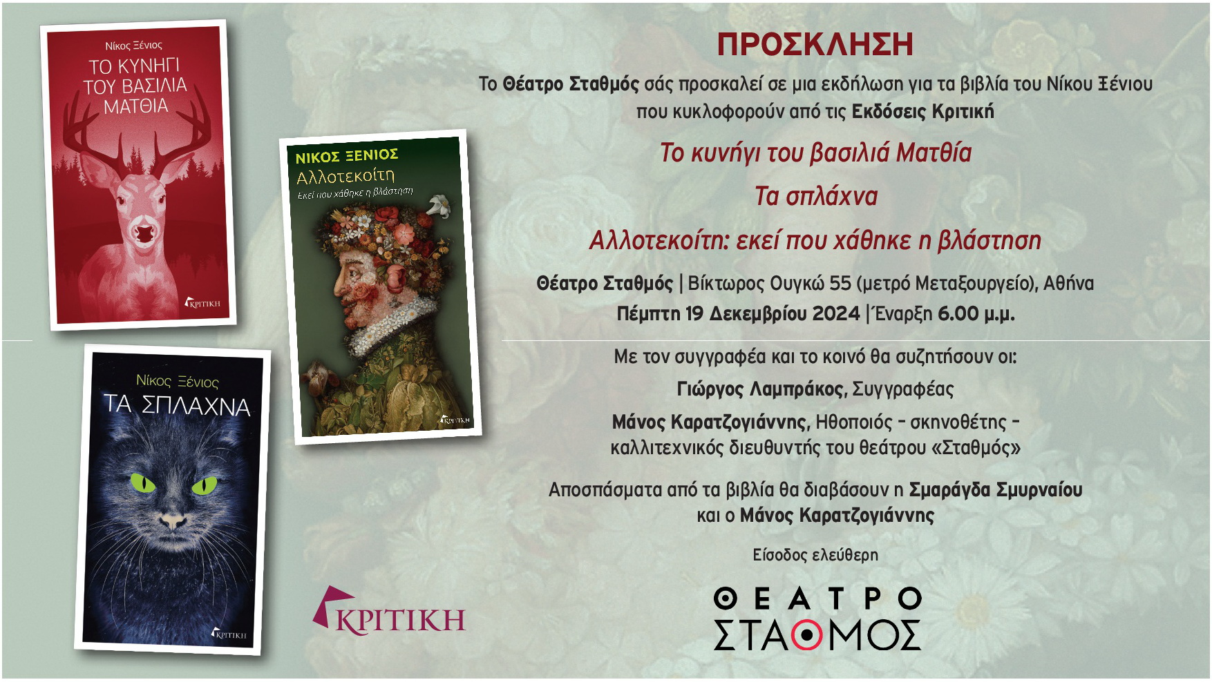 Αγαπητοί μου, θα ήταν μεγάλη μου τιμή να έρθετε στην παρουσίαση των τριών τελευταίων βιβλίων μου. Η συμμετοχή σας θα είναι πολύ ουσιαστική! Σας ευχαριστώ και σας περιμένω.